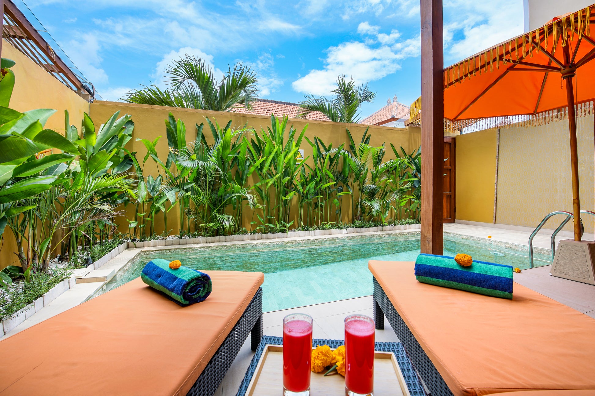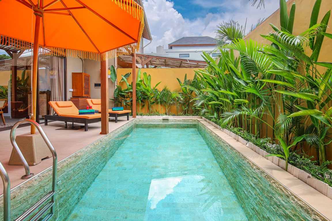 - Private Swimming Pool with size 5,5 x 2,6 meters complete with 2 sunbeds and umbrella, perfect for sunbathing or unwinding by the water.