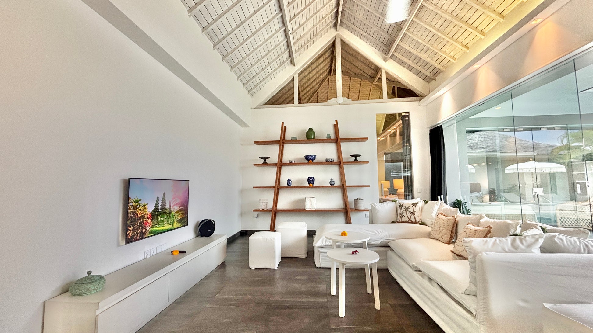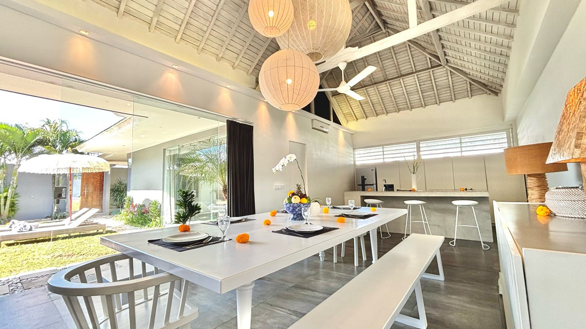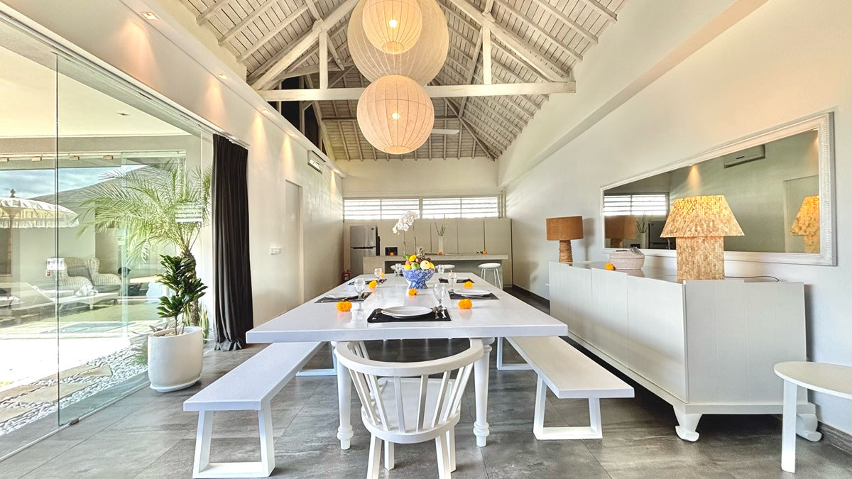 From the garden, step into the villa’s bright and spacious enclosed living and dining area, complete with a fully equipped kitchen. Whether you’re cooling off in the air-conditioned lounge or gathering around the dining table for a shared meal, this space invites connection and relaxation.