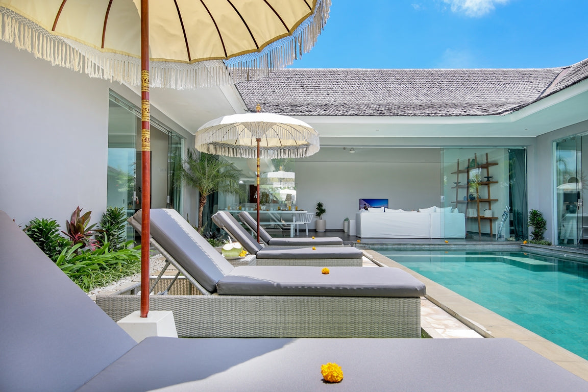 - Private Swimming Pool with comfortable sun loungers and pool umbrellas for shade, perfect for sunbathing or unwinding by the water.